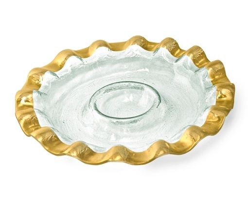 Party time! Nothing says time to celebrate like chips in a bowl. Ruffled edges hand-painted with a wide band of 24k gold or genuine platinum exude elegance, while the understated clear base and vast versatility of this handmade glass chip and dip bowl wil