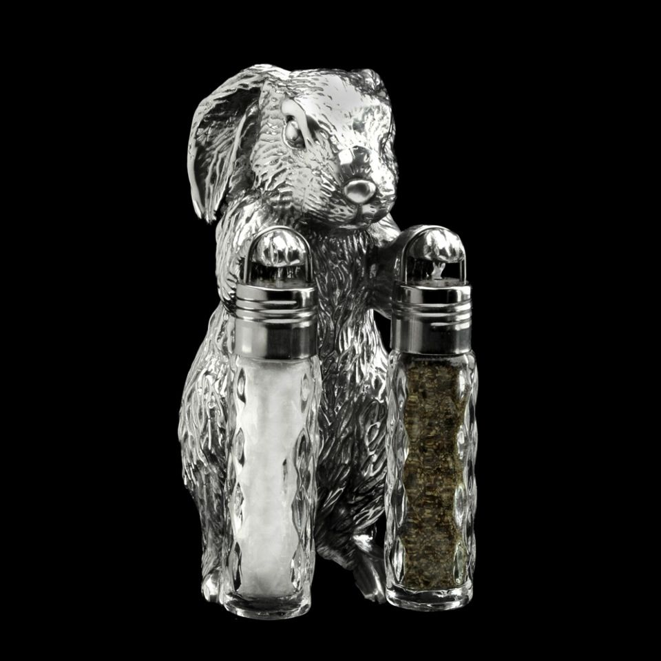Choose wisely from this rabbit sensei and have a little fun at the table with Arthur Court's Bunny Hanging Salt and Pepper Set. Masterful lines and fine detail give the rabbit a realistic appeal as he presents the glass dispensers in his outstretched ar