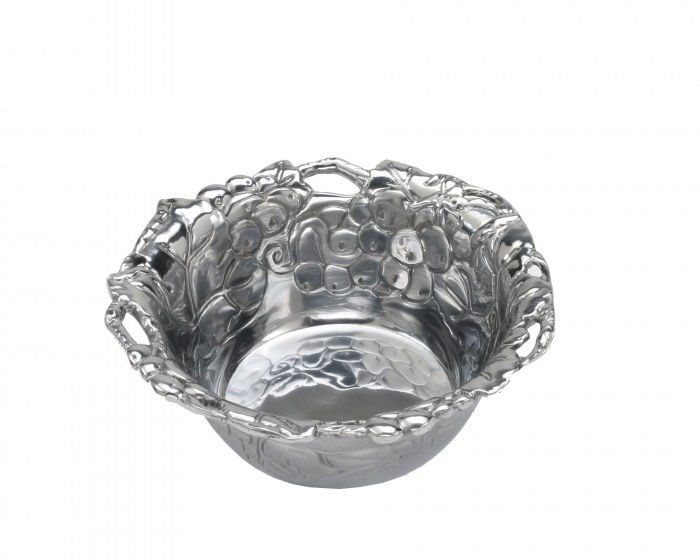 Large bundles of grapes and leaves cover the surface of this piece as vines create fingerholds in its flared edge. The heavy lines and dense patterns in this design give the handmade, aluminum bowl a unique texture. Size: Diameter: 6.0" / H: 2.5" Care: W