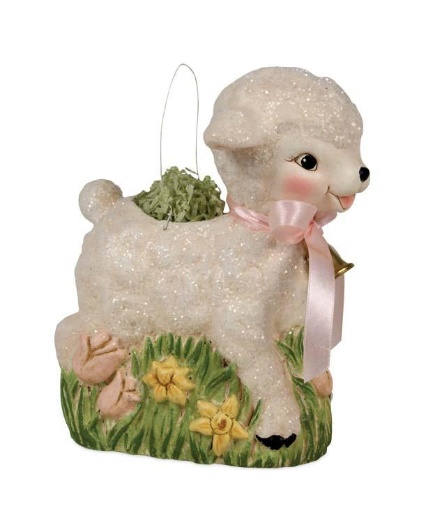 An adorable lamb bucket with retro charm. Hand-painted paper pulp lamb bucket embellished with glitter, ribbon and bell. 7.25" x 5.5".