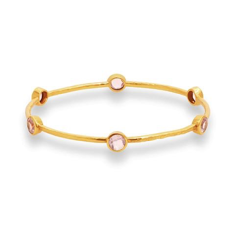 A lightly hammered bangle embellished with six sparkling gemstones. Pearl, imported glass, semi-precious stones, composed turquoise. 24K gold plate
