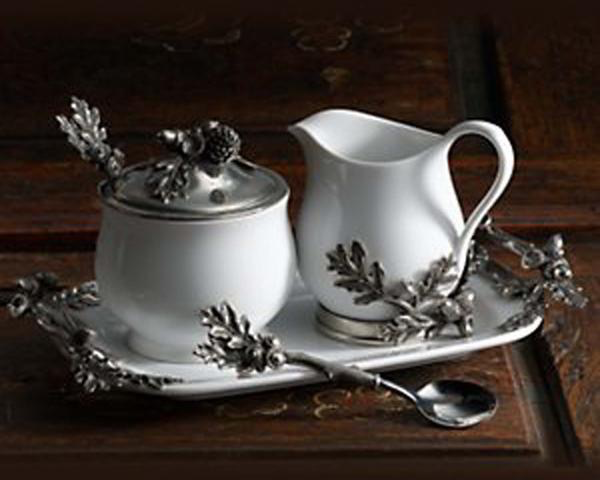 Wintery white stoneware accented with elegant silvery pewter oak leaves and acorns creates an elegant presentation for cream and sugar. Vagabond House's Acorn & Oak Leaf Creamer Set consists of a stoneware tray, with pewter oak twig handles finished in