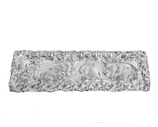 A group of rabbits band together in the middle of this tray as the dense forest surrounds them. Arthur Courts craftsmen capture incredible detail within the bunnies' fur and the framing foliage in this handmade, aluminum design. Size: L: 19.0" / W: 6.0" C