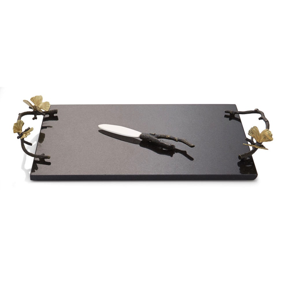 Board 18.5"W x 10"L x 3"H, Knife 7.75"L; Granite, Natural & Oxidized Bronze, Stainless Steel The Butterfly Ginkgo Collection celebrates the representation of flora as fauna. Michael's fascination with a particular type of ginkgo tree, the ginkgo Biloba,