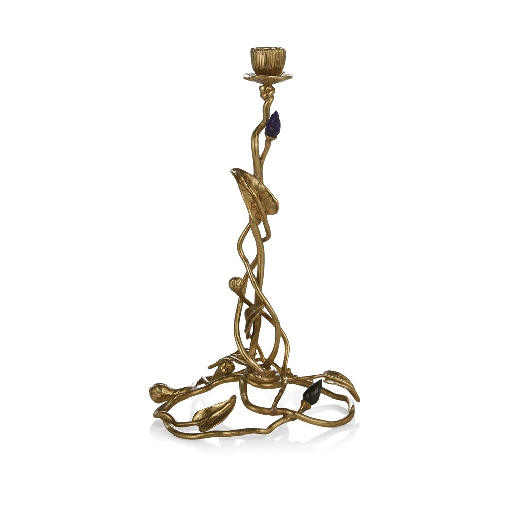 12.25"H; Natural Brass, Precious Stones, Swarovski Crystals Enchanted Garden is a collection inspired by the magical quality of spring. Sculpts of intertwined vines and stems gracefully emerge from a fantasy garden adorned with snails and semi-precious