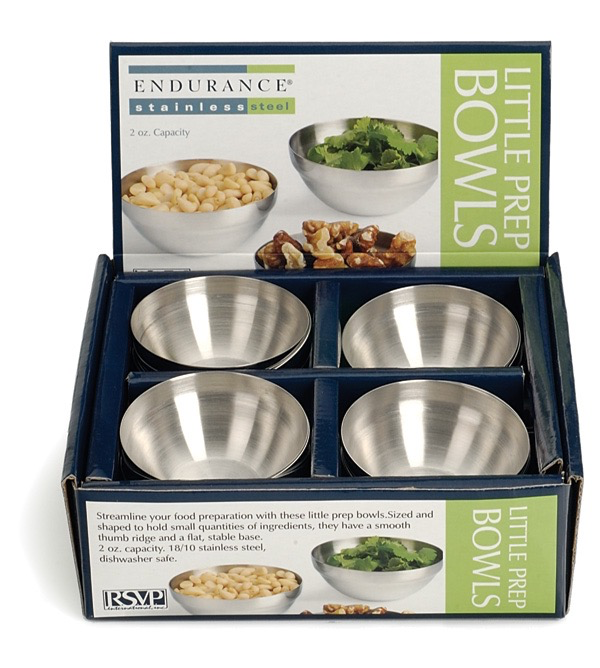 Our little prep bowls are sized and shaped to hold a small quantity of ingredients. They have a smooth thumb ridge and a flat, stable base. Made from 18/8 stainless steel, they hold 2 ounces and are dishwasher safe. Sold 24 pcs. in a counter display box.