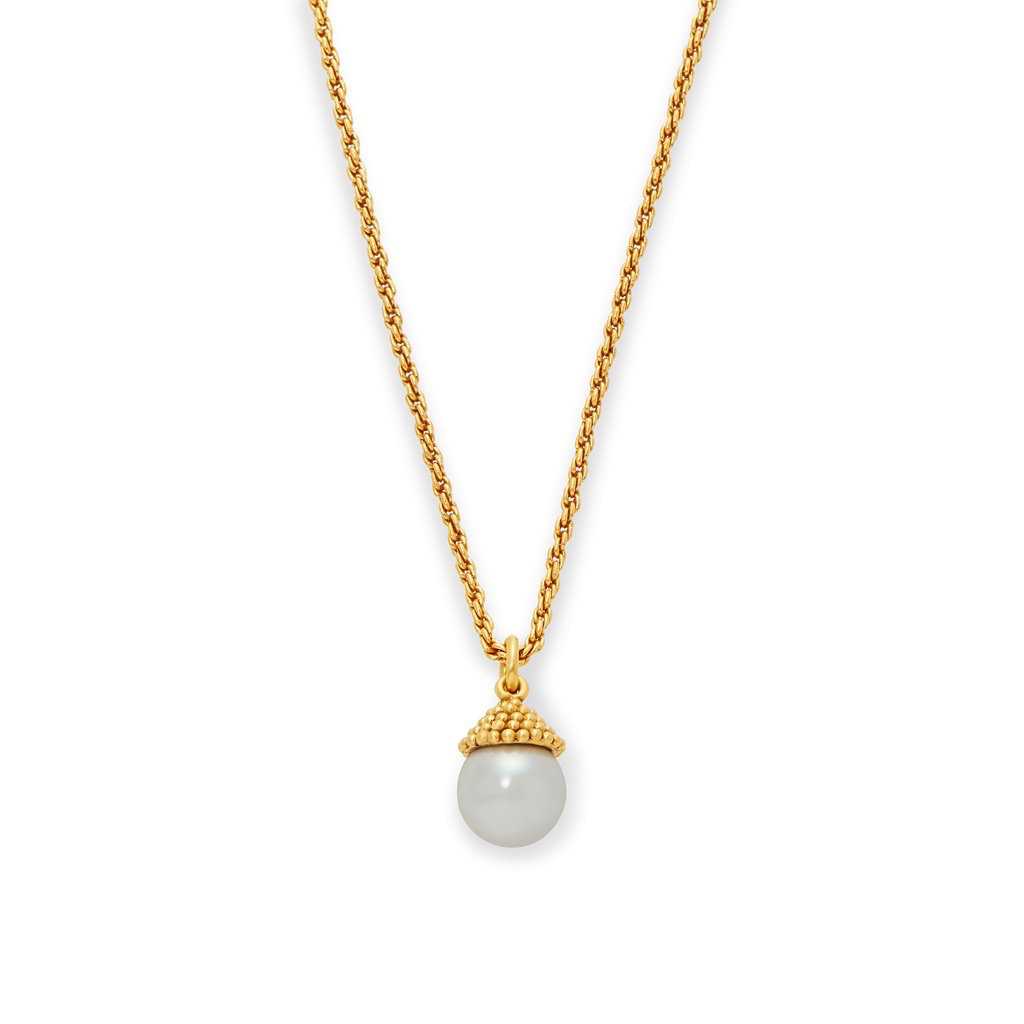 Sweet 10mm shell pearl with gilded beaded cap on a decorative chain. 17-18 inches. 24K gold plate. Julie Vos hallmark.