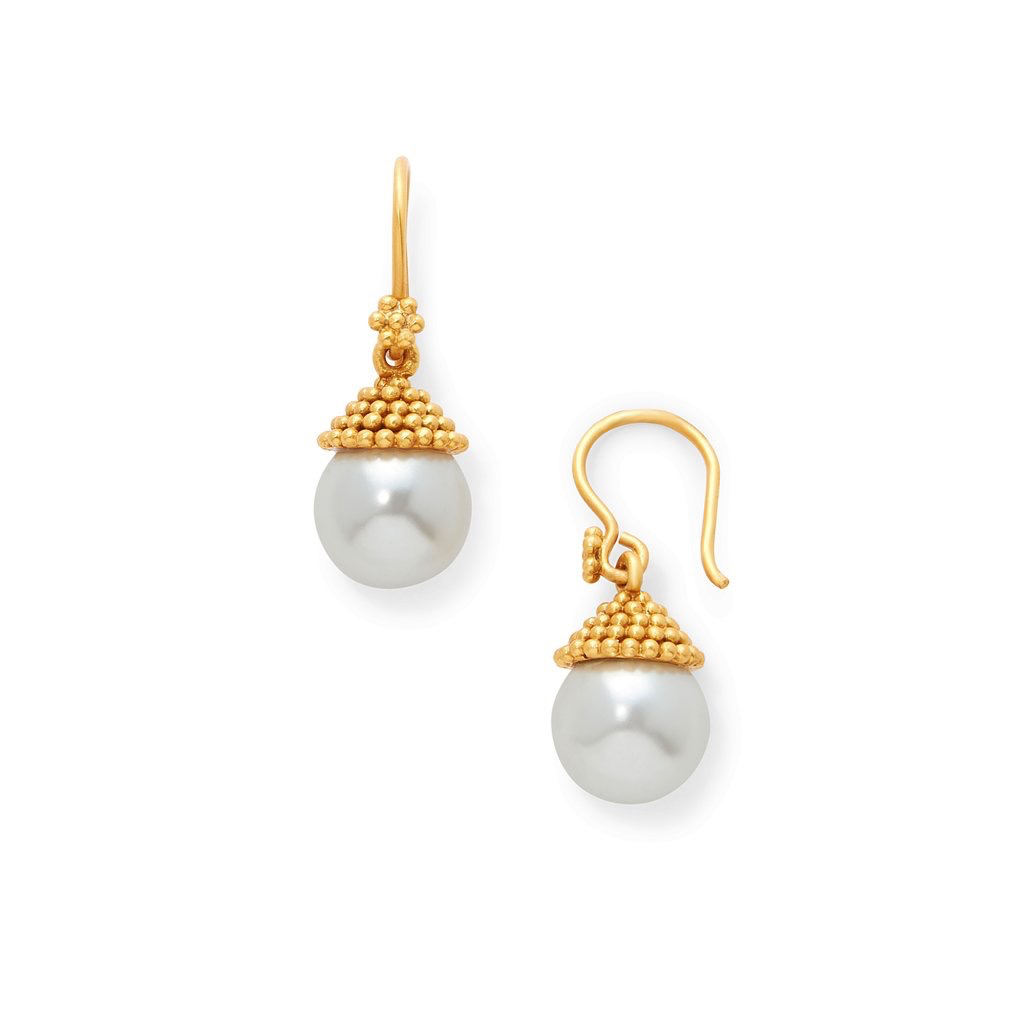 Sweet 10mm shell pearl with a beaded cap. 0.75 inches. 24K gold plate.