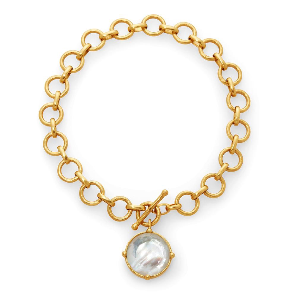 Statement size rose cut sparkling imported glass and mother of pearl doublet on a lightly hammered link, finished with a front toggle closure. Cameo bee on reverse side. 19 inches. 24K gold plate.