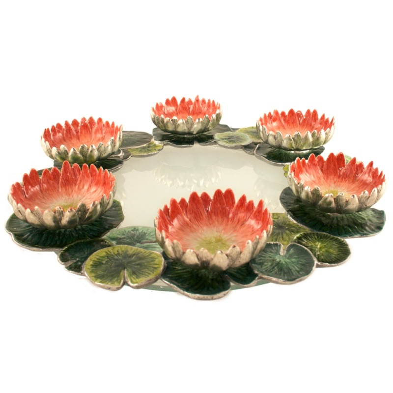Handcrafted in aluminium and resting on a glass platter, this gorgeously hand-painted lotus-inspired crudité platter with removable bowls can be used for dips, candy and nuts - and can double up as a Seder plate too. Dimensions: H 2" Dia 14"