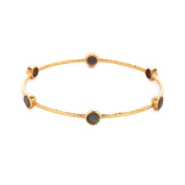 A lightly hammered bangle embellished with six sparkling gemstones. Pearl, imported glass, semi-precious stones, composed turquoise. 24K gold plate.
