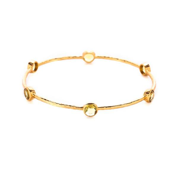 A lightly hammered bangle embellished with six sparkling gemstones. Pearl, imported glass, semi-precious stones, composed turquoise. 24K gold plate.