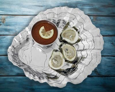 Make Arthur Court's Oyster W/Pearl Chip and Dip the treasure of your serve ware. Heavy, textured lines run across the shell's interior as the horizontal pattern draws your eyes downward. A second, smaller bowl sits at the basin of the shell and contains