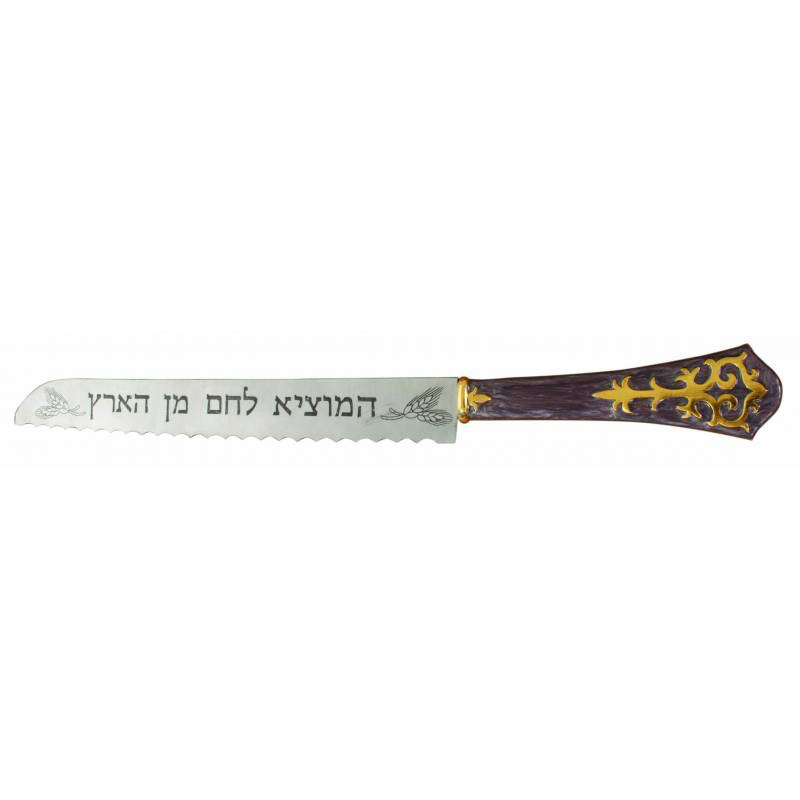 Part of the Byzantine collection, this pewter handle hand painted in dusty purple is minimalist in the best way. Decorated along the handle is a gold filigree design. The long serrated blade makes it a great choice for challah cutting and bringing a taste