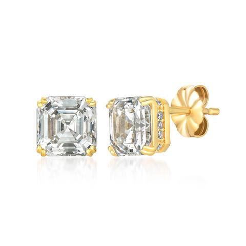A classic asscher cut stone sits on top of a subtle border of micro-pave stones giving these studs a stunning, royal twist. .925 sterling silver finished in 18kt gold Carat total weight: 4.20, individual earring 2.00 CT center stone 0.27" diameter