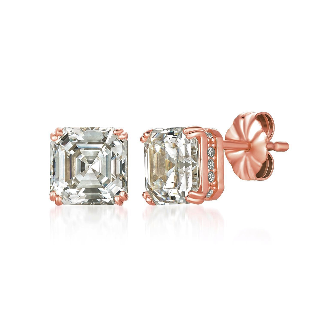 A classic asscher cut stone sits on top of a subtle border of micro-pave stones giving these studs a stunning, royal twist. .925 sterling silver finished in 18kt rose gold Carat total weight: 4.20, individual earring 2.00 CT center stone 0.27" diameter
