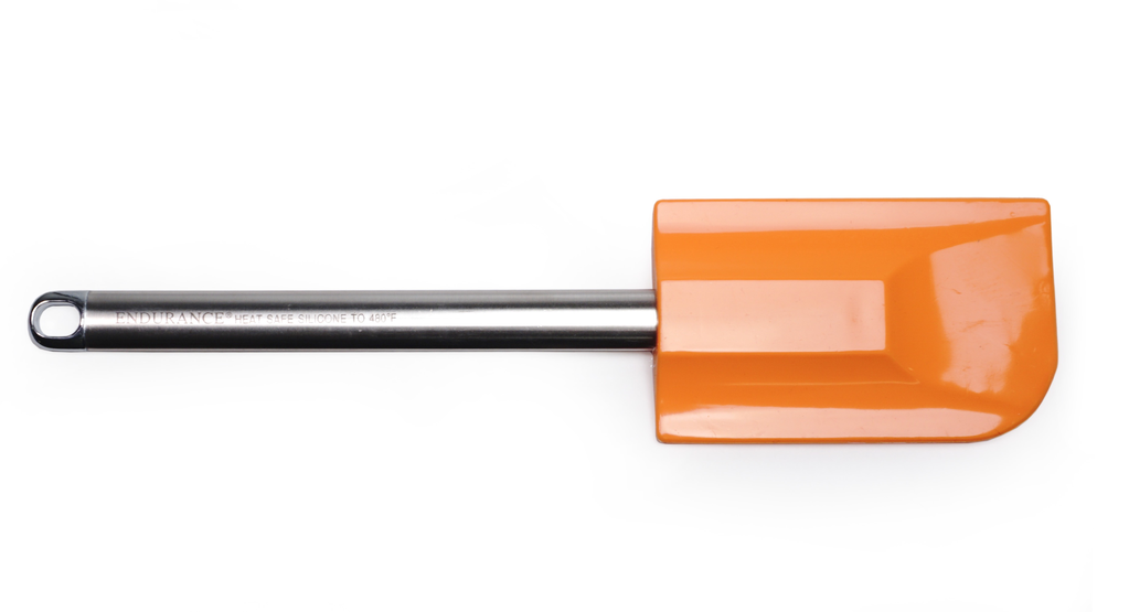 This workhorse spatula is made with colorful orange silicone which is extremely flexible and heat safe up to 480°F / 250°C. The 18/8 stainless steel handle has a tubular oval shape for a comfortable grip. Dishwasher safe. Spatula measures 2-3/4″ x 4-3/8″