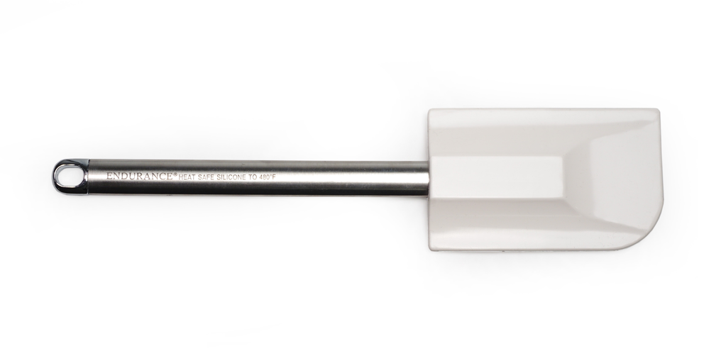 This workhorse spatula is made with colorful orange silicone which is extremely flexible and heat safe up to 480°F / 250°C. The 18/8 stainless steel handle has a tubular oval shape for a comfortable grip. Dishwasher safe. Spatula measures 2-3/4″ x 4-3/8″
