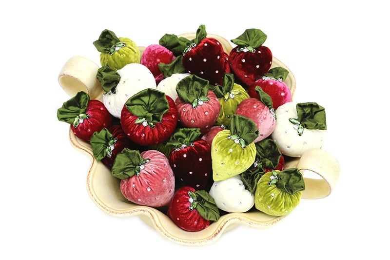 handmade silk velvet strawberries with Swarovski crystal seeds. Perfect for every home--the sweet treat that lasts forever. Featured in classic cherry. Shipping included anywhere in the continental US.