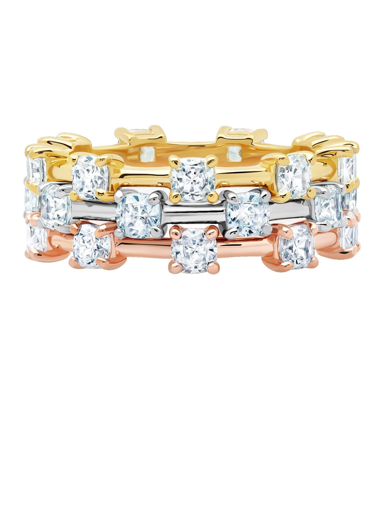 Wear this stackable set as one statement piece or separate them for a daintier look. .925 sterling silver 3 separate eternity bands finished in pure platinum, 18kt gold and 18kt rose gold Carat total weight: 2.70 3 mm cushion cut cubic zirconia stones