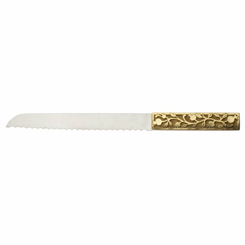 Part of the Pomegranate Collection, this handcrafted knife is perfect for cutting anything and everything. The knife handle is made from a gorgeous wood with a long, serrated blade, making it perfect for Friday night challah, too! There is a golden pewter
